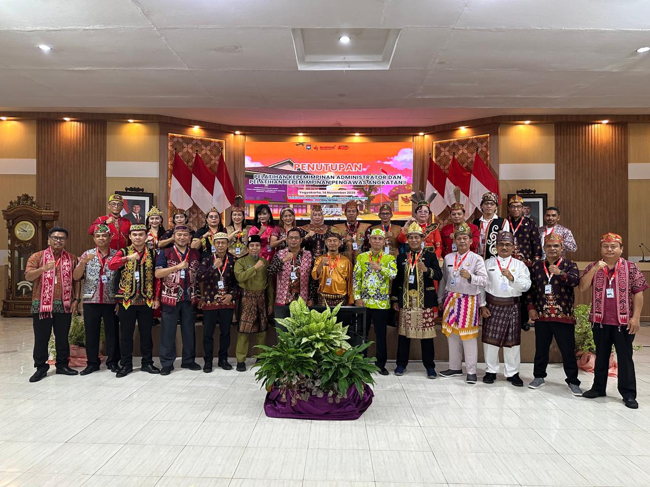 YOGYAKARTA — Delapan belas peserta Pelatihan Kepemimpinan Administrator (PKA) dan Pelatihan Kepemimpinan Pengawas (PKP) Angkatan I dari Kabupaten Barito Timur lulus seluruhnya pada penutupan kegiatan yang digelar di PPSDM Regional Yogyakarta, Jumat (14/11) pagi. Penutupan dipimpin Koordinator Widyaiswara, Dra. R.R. Eka Rini Nurhayati, M.Si, mewakili Kepala PPSDM Regional Yogyakarta. Dalam sambutannya, Eka Rini menyampaikan apresiasi atas komitmen peserta selama mengikuti keseluruhan rangkaian pembelajaran, baik on-campus maupun off-campus. Ia menegaskan bahwa kemampuan kepemimpinan yang diperoleh selama pelatihan harus menjadi modal untuk meningkatkan kualitas birokrasi di daerah. “Pelatihan ini tidak sekadar formalitas, tetapi pembentukan karakter dan kapasitas kepemimpinan yang harus diimplementasikan di tempat kerja,” katanya.