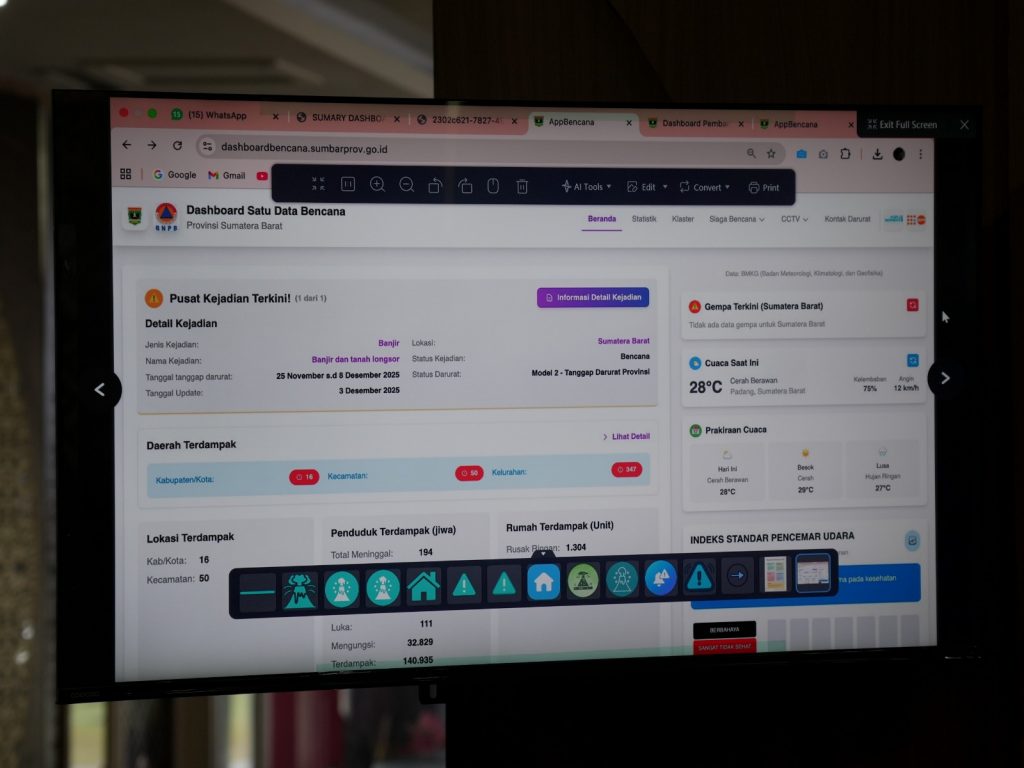 Padang, 3 Desember 2025_ – Penanganan bencana banjir dan longsor di Sumatra Barat (Sumbar) kini dilakukan lebih efektif dengan dukungan data berbasis digital. Dinas Komunikasi dan Informatika (Diskominfo) Sumbar telah mengembangkan sistem informasi kebencanaan bernama “Satu Data Bencana”, yang menjadi dasar pengambilan keputusan oleh para pemangku kepentingan. Kepala Diskominfo Sumbar, Rudy Rinaldy, mengatakan sistem tersebut berfungsi menghimpun dan menyajikan seluruh informasi terkait kebencanaan secara terstruktur. “Kami memfokuskan pengelolaan data pada dasbor Satu Data Bencana. Dasbor ini baru diluncurkan sekitar satu minggu lalu, dan dua hari sebelum peluncuran, kejadian bencana sudah mulai…