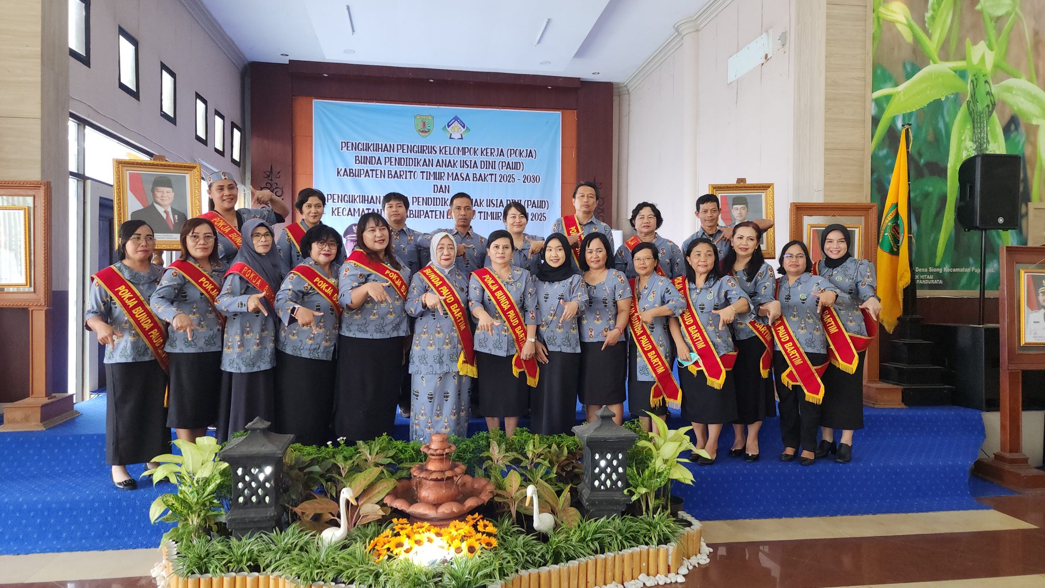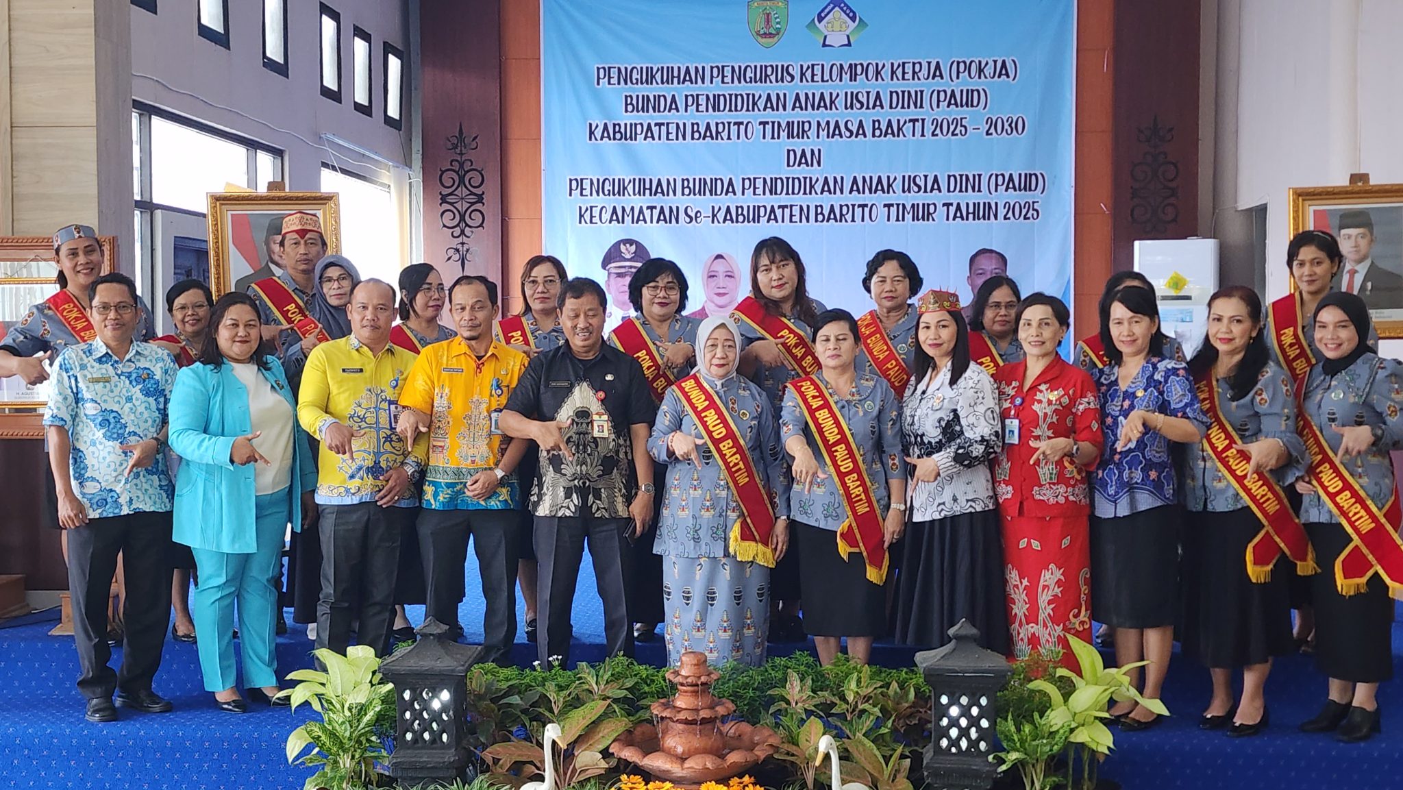 Tamiang Layang – Bunda PAUD Kabupaten Barito Timur, Misnawaty M. Yamin, menegaskan pentingnya sinergi semua pihak dalam memajukan pendidikan anak usia dini (PAUD) di daerah. Hal itu disampaikan saat dirinya mengukuhkan Kelompok Kerja (Pokja) Bunda PAUD Kabupaten Barito Timur masa bakti 2025–2030 serta Bunda PAUD kecamatan se-Barito Timur, Kamis (23/10/2025), di Aula Rumah Jabatan Bupati. Dalam sambutannya, Misnawaty menyampaikan rasa bangga dan apresiasi kepada para pengurus yang baru saja dikukuhkan. Ia yakin dengan kepengurusan yang baru, kualitas PAUD di Barito Timur akan semakin maju dan berkembang. “Pendidikan anak usia dini adalah pondasi penting dalam membentuk generasi yang cerdas, berakhlak mulia, dan berdaya saing global. Saya berharap Pokja Bunda PAUD dan para Bunda PAUD kecamatan menjadi motor penggerak dalam meningkatkan kualitas PAUD menuju generasi emas Barito Timur,” ujarnya. Bunda PAUD Barito Timur juga menekankan pentingnya kerja sama lintas sektor antara Pokja Bunda PAUD, pemerintah daerah, Dinas Pendidikan, dan organisasi mitra seperti PKK, IGTKI, HIMPAUDI, dan IDI. Kolaborasi tersebut, katanya, menjadi kunci untuk menghadirkan layanan PAUD yang holistik dan integratif serta meningkatkan partisipasi masyarakat dalam mendukung tumbuh kembang anak usia dini. “Dengan kerja sama dan dedikasi yang tinggi, kita dapat menciptakan generasi yang lebih baik, maju, dan berkualitas,” tegasnya. Misnawaty juga memberikan pesan khusus kepada para Bunda PAUD kecamatan agar terus berperan aktif di wilayah masing-masing. Ia berharap para Bunda PAUD menjadi penggerak dan motivator bagi masyarakat serta para pemangku kepentingan untuk menyediakan layanan PAUD yang berkualitas hingga ke tingkat desa. Acara pengukuhan berlangsung khidmat dengan dihadiri Bupati Barito Timur M. Yamin, Wakil Bupati, jajaran asisten, kepala OPD, camat se-Barito Timur, serta para pengurus organisasi mitra pendidikan. Mengakhiri sambutannya, Bunda PAUD Misnawaty M. Yamin menyampaikan harapan agar amanah yang diberikan dapat dijalankan dengan penuh tanggung jawab dan keikhlasan. “Mari bersama kita wujudkan Barito Timur yang cerdas sejak usia dini,” pungkasnya. (Cak).