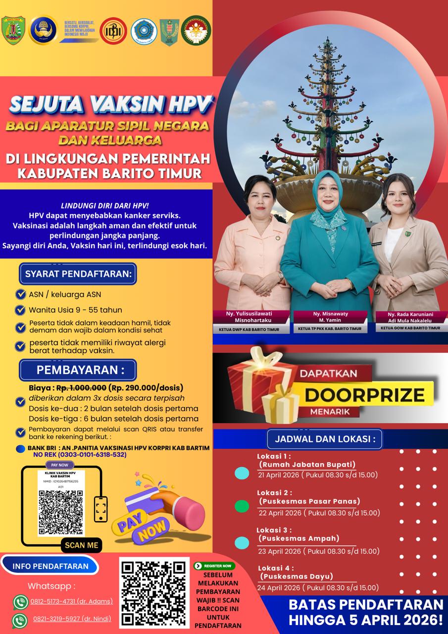 TAMIANG LAYANG – Bupati Barito Timur, M. Yamin, mengimbau Aparatur Sipil Negara (ASN) perempuan serta kerabat ASN di lingkungan Pemerintah Kabupaten Barito Timur untuk mengikuti vaksinasi Human Papillomavirus (HPV) sebagai langkah pencegahan kanker serviks.Imbauan tersebut disampaikan Bupati melalui Surat Edaran no:340/030/BUM/2026 tentang Himbauan Mengikuti Vaksinasi Human Papillomavirus (HPV) bagi Aparatur Sipil Negara dan Kerabat ASN di Lingkungan Pemerintah Kabupaten Barito Timur.Menurut Bupati Barito Timur, vaksinasi HPV merupakan langkah penting dalam upaya meningkatkan kesehatan masyarakat, khususnya bagi perempuan, serta sebagai tindakan pencegahan terhadap risiko kanker serviks atau kanker leher rahim yang menjadi salah satu penyebab kematian tertinggi pada perempuan.“Kami mengimbau ASN perempuan dan kerabat ASN agar memanfaatkan kesempatan ini dengan mengikuti vaksinasi HPV sesuai jadwal yang telah ditentukan,” ujar M. Yamin.Orang Nomor Satu di Barti mini juga meminta pimpinan instansi vertikal, perangkat daerah, serta para camat untuk mengimbau ASN perempuan dan kerabat ASN di lingkungan kerja masing-masing agar mengikuti program vaksinasi tersebut.Pelaksanaan vaksinasi HPV akan dilakukan secara bertahap. Tahap pertama dijadwalkan pada 21 April 2026 di Aula Rumah Jabatan Bupati Barito Timur, dilanjutkan 22 April 2026 di Puskesmas Pasar Panas, 23 April 2026 di Puskesmas Ampah, serta 24 April 2026 di Puskesmas Dayu. Kegiatan vaksinasi dilaksanakan mulai pukul 08.00 hingga 15.00 WIB.Bupati M. Yamin juga meminta kepala instansi vertikal, OPD, dan camat untuk memberikan izin atau dispensasi waktu kepada pegawai yang akan mengikuti vaksinasi sesuai jadwal yang telah ditetapkan.Melalui program ini, Pemerintah Kabupaten Barito Timur berharap kesadaran akan pentingnya pencegahan kanker serviks semakin meningkat serta dapat memberikan perlindungan kesehatan bagi ASN perempuan dan keluarga mereka.(cak)