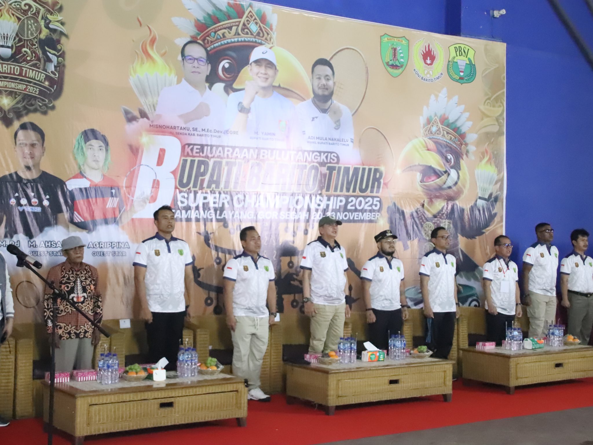 TAMIANG LAYANG — Bupati Barito Timur M. Yamin bersama Wakil Bupati Adi Mula Nakalelo membuka secara resmi Bupati Barito Timur Super Championship 2025, Kamis (20/11/2025), di GOR Jalan Nansarunai Tamiang Layang. Kejuaraan bulutangkis tingkat kabupaten ini menjadi salah satu rangkaian peringatan Hari Jadi Barito Timur ke-23 dan HUT ke-80 Republik Indonesia. Usai pembukaan kepada wartawan Bupati Yamin mengatakan turnamen tersebut dapat menjadi panggung sportivitas sekaligus sarana mempererat kebersamaan para pegiat bulutangkis di Barito Timur dan sekitarnya.