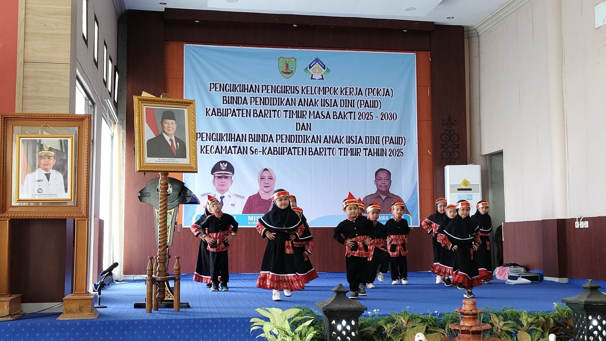 Bupati juga menekankan pentingnya sinergi lintas sektor dalam memajukan layanan PAUD yang holistik dan integratif. Pokja Bunda PAUD dan para Bunda PAUD kecamatan diharapkan bekerja dengan semangat, proaktif, dan bertanggung jawab, serta menjalin kolaborasi erat dengan Dinas Pendidikan, Dinas Kesehatan, PKK, HIMPAUDI, IGTKI, dan lembaga lainnya. Dalam sambutannya, Bupati Yamin juga menyinggung Gerakan Tujuh Kebiasaan Anak Indonesia Hebat yang menanamkan nilai-nilai positif pada anak sejak dini, seperti bangun pagi, beribadah, berolahraga, makan bergizi, gemar belajar, bersosialisasi, dan tidur cukup. “Gerakan ini sejalan dengan visi besar Asta Cita Presiden Prabowo Subianto dan Wakil Presiden Gibran Rakabuming Raka, khususnya dalam memperkuat pembangunan sumber daya manusia yang unggul dan berkarakter,” katanya. Dengan mengucap Bismillahirrahmanirrahim, kegiatan pengukuhan Pokja Bunda PAUD Kabupaten Barito Timur masa bakti 2025–2030 dan Bunda PAUD kecamatan se-Barito Timur resmi dibuka. Bupati berharap kehadiran para Bunda PAUD menjadi penggerak utama dalam mencetak generasi emas Barito Timur menuju Indonesia Emas 2045. “Mari kita bekerja sama, saling mendukung, dan berkolaborasi untuk kemajuan pendidikan anak usia dini di Barito Timur,” pungkasnya. (Cak).