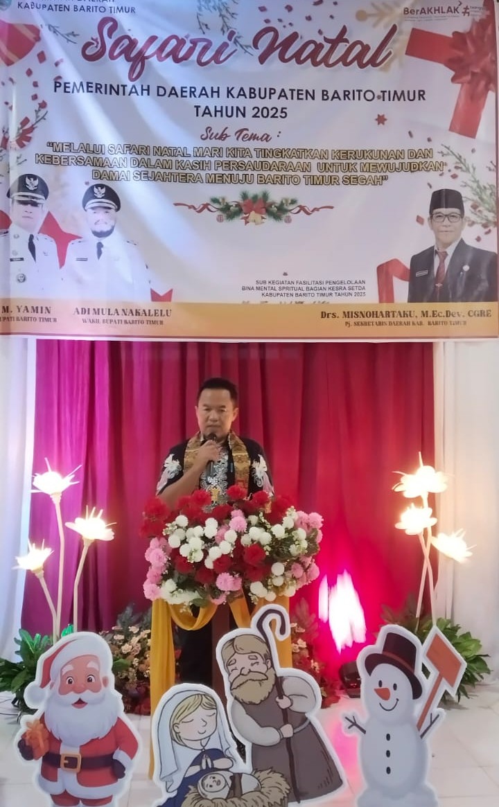 TAMIANG LAYANG— Pemerintah Kabupaten Barito Timur terus menunjukkan komitmen kuat dalam mendukung pembangunan dan pengembangan rumah ibadah di seluruh wilayah kecamatan. Hal tersebut ditegaskan Bupati Barito Timur, M. Yamin, dalam rangkaian kegiatan Safari Natal 2025 yang digelar di Aula Kecamatan Raren Batuah, Rabu (10/12/2025).