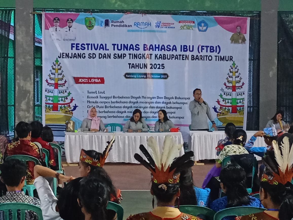 Tamiang Layang— Pemerintah Kabupaten Barito Timur melalui Dinas Pendidikan kembali menggelar Festival Tunas Bahasa Ibu (FTBI) jenjang SD dan SMP tingkat kabupaten tahun 2025. Kegiatan ini berlangsung di Gedung Tenis Indoor Ruang Terbuka Hijau (RTH) Nansarunai, Jalan Nansarunai Tamiang Layang, Kamis (23/10). Festival yang diikuti sekitar 200 peserta ini menjadi ajang pelestarian dan pengembangan bahasa daerah, khususnya Bahasa Dayak Maanyan dan Bahasa Bakumpai, di kalangan pelajar.