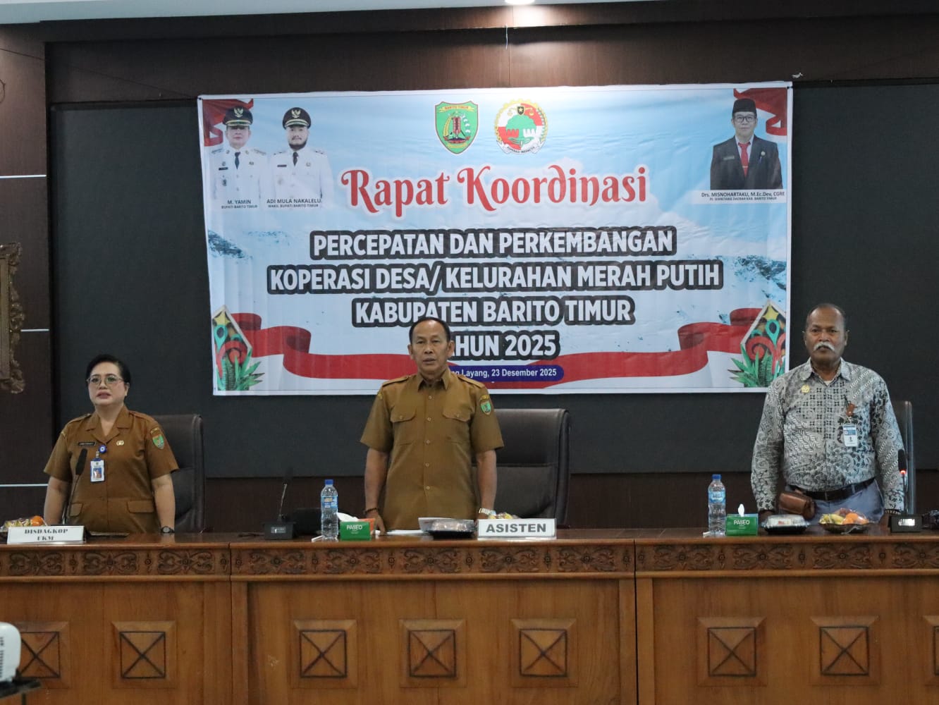 TAMIANG LAYANG — Pemerintah Kabupaten Barito Timur menegaskan komitmennya mempercepat penguatan Koperasi Desa/Kelurahan Merah Putih sebagai tulang punggung ekonomi kerakyatan. Penegasan itu disampaikan Bupati Barito Timur M. Yamin melalui sambutan yang dibacakan Asisten II Sekretariat Daerah, Amrullah, pada Rapat Koordinasi Percepatan Koperasi Desa/Kelurahan Merah Putih, Selasa (23/12/2025).Dalam sambutan tersebut, Bupati menekankan bahwa koperasi tidak cukup hanya dibentuk, tetapi harus didukung legalitas lengkap dan kepastian lahan usaha agar mampu berkembang secara profesional, akuntabel, dan berdaya saing.