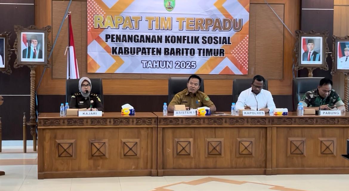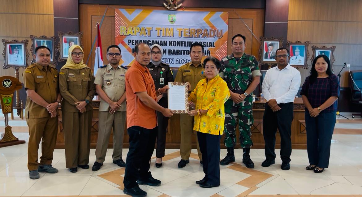 TAMIANG LAYANG – Tim Penyelesaian Konflik Sosial (PKS) Pemerintah Kabupaten Barito Timur kembali menggelar mediasi keempat antara ahli waris almarhum Nertia Lenda dengan pihak PT. MUTU terkait penyelesaian sengketa lahan, Senin (6/10/2025), di Ruang Rapat Bupati Barito Timur. Mediasi dipimpin oleh Asisten I Sekretariat Daerah Kabupaten Barito Timur, Ari Panan P. Lelo, dan dihadiri oleh perwakilan dari Polres Barito Timur, Kodim 1012 Buntok, Kejaksaan Negeri Barito Timur, ATR/BPN, Dinas Lingkungan Hidup, Camat Patangkep Tutui dan Pematang Karau, jajaran Badan Kesbangpol, perwakilan PT. MUTU, serta keluarga ahli waris Nertia Lenda. Agenda mediasi kali ini difokuskan pada sinkronisasi data antara kedua belah pihak sebagaimana hasil kesepakatan dalam mediasi ketiga pada 29 September 2025 lalu. Namun, setelah mendengarkan penjelasan dari kedua pihak dan berbagai instansi terkait, kesepakatan kembali belum tercapai.
