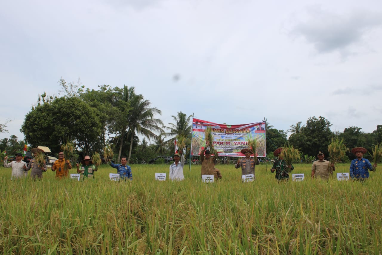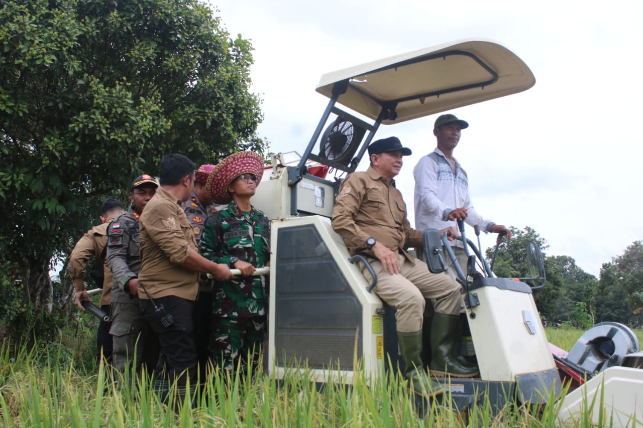 Bupati M. Yamin bersama jajaran Forkopimda kemudian turut serta dalam panen padi hibrida dan melakukan uji coba traktor pertanian modern yang mampu mempercepat proses panen di lapangan.