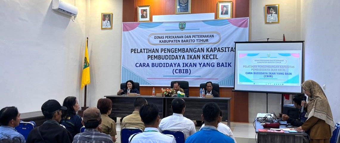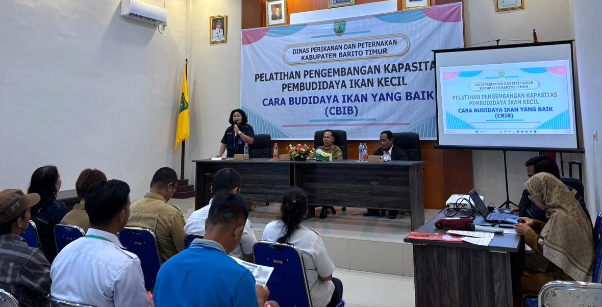 TAMIANG LAYANG — Pemerintah Kabupaten Barito Timur melalui Dinas Perikanan dan Peternakan menggelar Pelatihan Peningkatan Kapasitas Pembudidaya Ikan Kecil “Cara Budidaya Ikan yang Baik (CBIB)” di Aula Dinas Perikanan dan Peternakan, Senin (8/11/2025). Kegiatan ini diikuti para pelaku usaha dan kelompok pembudidaya ikan kecil dari berbagai kecamatan di Barito Timur.