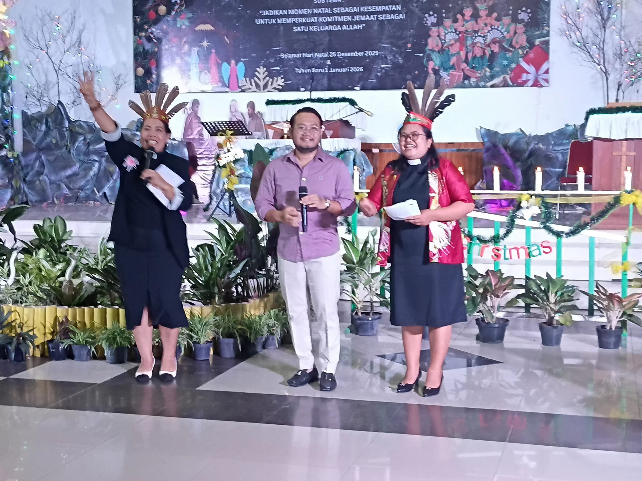 Wakil Bupati juga menekankan pentingnya menjaga Tri Kerukunan Umat Beragama, yaitu kerukunan internal umat beragama, kerukunan antarumat beragama, serta kerukunan antara umat beragama dengan pemerintah.“Melalui kegiatan seperti ini, terjalin komunikasi yang baik antara masyarakat dan pemerintah. Masyarakat dapat menyampaikan aspirasi dan harapannya, sehingga pembangunan daerah dapat berjalan dengan lancar dan berkelanjutan,” katanya.Pada kesempatan tersebut, Wakil Bupati mengajak seluruh jemaat untuk menghayati Tema Natal Nasional 2025, “Allah Hadir untuk Menyelamatkan Keluarga” (Matius 1:21–24), dengan subtema kegiatan “Jadikan Momen Natal sebagai Kesempatan untuk Memperkuat Komitmen Jemaat sebagai Satu Keluarga Allah.”Ia berharap semangat Natal mampu menumbuhkan sikap saling mengasihi, menjadi pembawa damai, serta memperkuat keharmonisan di tengah kehidupan bermasyarakat yang majemuk.
