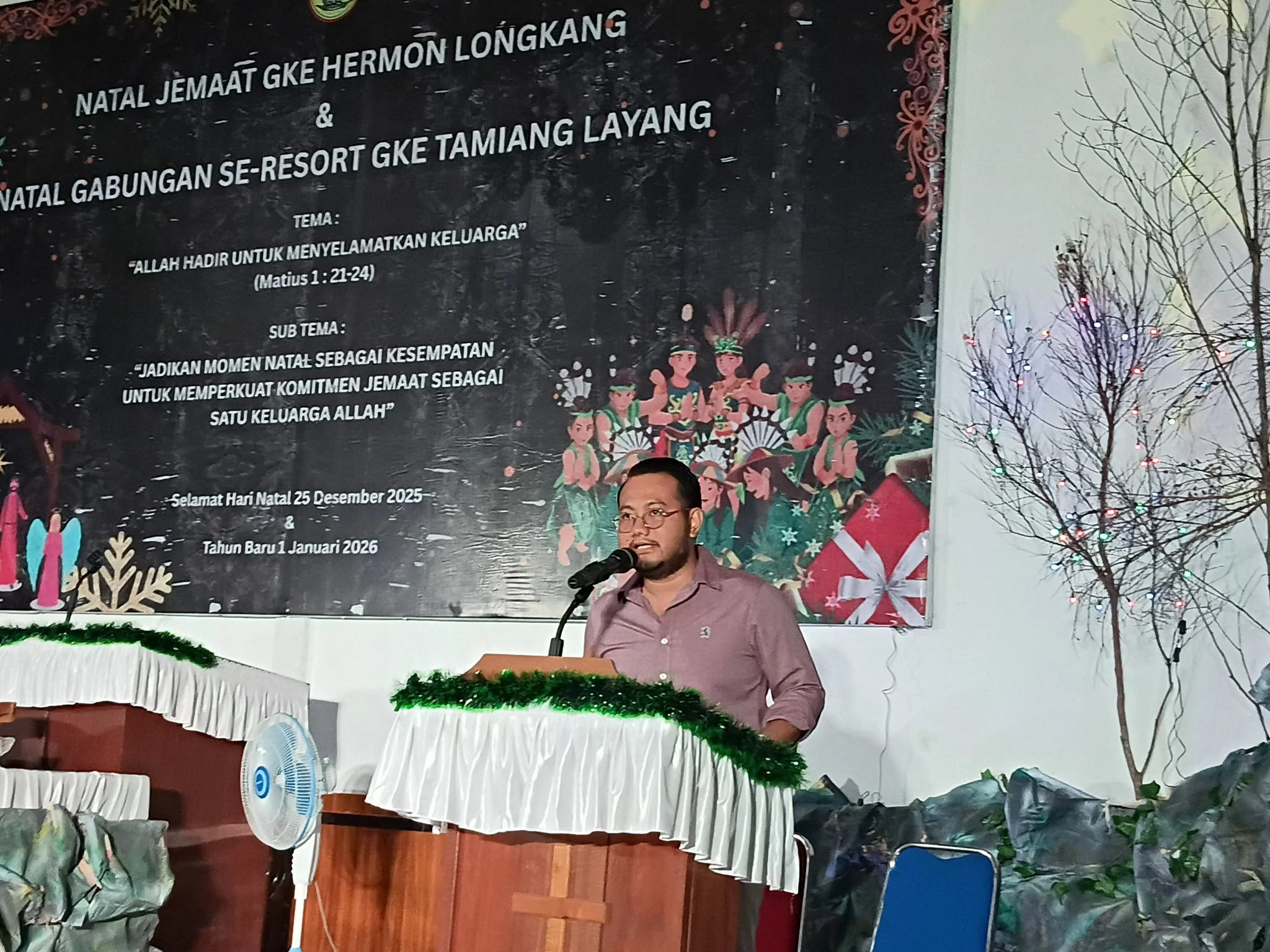 TAMIANG LAYANG – Wakil Bupati Barito Timur, Adi Mula Nakalelu, mengajak seluruh jemaat Gereja Kalimantan Evangelis (GKE) untuk menjadikan perayaan Natal sebagai momentum memperkuat persaudaraan, kebersamaan, serta kerukunan dalam kehidupan bermasyarakat.Ajakan tersebut disampaikannya saat menghadiri Ibadah dan Perayaan Natal Jemaat GKE Hermon Longkang sekaligus se-Resort GKE Tamiang Layang Tahun 2025, yang digelar pada Sabtu (20/12/2025).Dalam sambutannya, Wakil Bupati menyampaikan bahwa Natal bukan sekadar perayaan rutin tahunan, melainkan momen penting bagi umat Kristiani untuk memaknai kelahiran Yesus Kristus sebagai wujud kasih dan keselamatan bagi umat manusia.