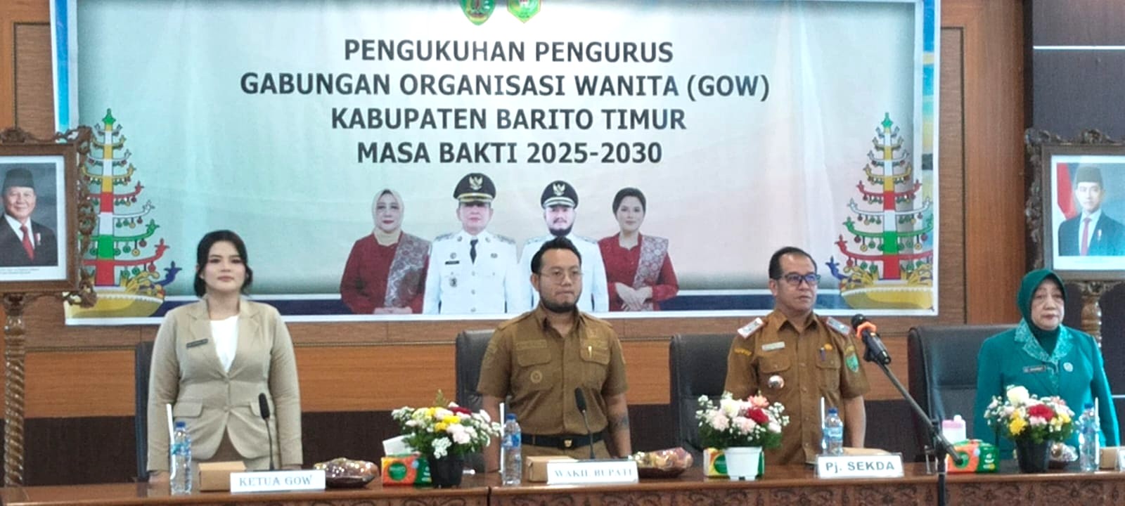 TAMIANG LAYANG — Wakil Bupati Barito Timur Adi Mula Nakalelu menegaskan bahwa Gabungan Organisasi Wanita (GOW) memiliki peran strategis sebagai garda terdepan dalam pemberdayaan perempuan, peningkatan kesejahteraan keluarga, serta pembinaan generasi muda. Penegasan tersebut disampaikannya saat mengukuhkan Pengurus GOW Kabupaten Barito Timur, Senin (15/12/2025), di Ruang Rapat Bupati Barito Timur.