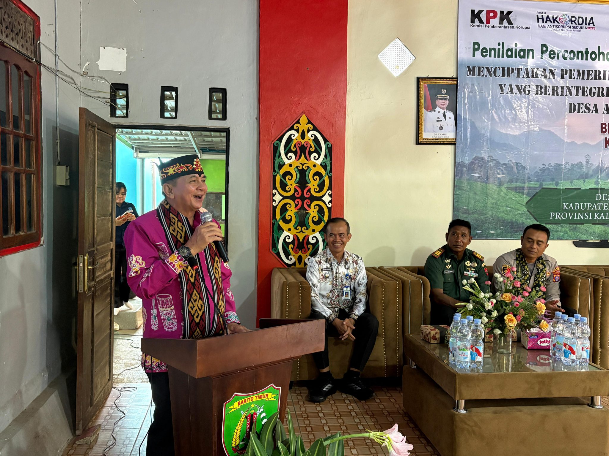 Ia mendorong seluruh perangkat desa untuk meningkatkan kapasitas, memperkuat pengawasan internal, serta melibatkan masyarakat secara aktif dalam proses pembangunan desa. Leonard juga mengajak masyarakat menjadikan kegiatan ini sebagai momentum meneguhkan nilai kejujuran, tanggung jawab, dan partisipasi publik. Hingga saat ini, Desa Bagok telah memperoleh nilai 83,5 persen dari total penilaian yang mencakup lima variabel dan 79 indikator. Nilai tersebut diharapkan meningkat setelah penilaian lanjutan. Sementara itu, Bupati Barito Timur M. Yamin dalam sambutannya menyampaikan apresiasi kepada pemerintah Desa Bagok, mulai dari kepala desa, perangkat, BPD, tokoh adat, hingga masyarakat yang telah bekerja sama mendukung kegiatan ini. “Kita tidak perlu menunggu hal besar untuk memulai perubahan. Pencegahan korupsi bisa dimulai dari kebiasaan kecil — tidak menutupi informasi publik, tidak menyalahgunakan amanah, dan tidak mengambil yang bukan haknya,” tegasnya. Ia berharap penilaian ini tidak hanya menjadi kompetisi, melainkan awal terbentuknya budaya baru di Desa Bagok: budaya yang jujur, terbuka, dan saling mengingatkan dalam kebaikan.(lia/asa).