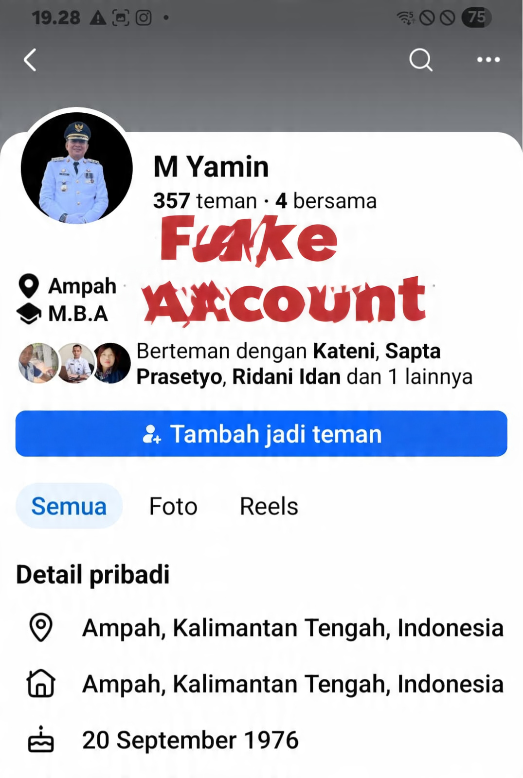 TAMIANG LAYANG – Munculnya akun Facebook yang mengatasnamakan M. Yamin dengan menggunakan foto Bupati Barito Timur menjadi perhatian masyarakat. Akun tersebut dipastikan bukan milik Bupati Barito Timur dan merupakan akun palsu.Bupati Barito Timur M. Yamin menegaskan bahwa dirinya tidak pernah membuat maupun memiliki akun Facebook atas nama tersebut. Karena itu, masyarakat diminta untuk tidak mudah percaya terhadap akun yang menggunakan nama maupun foto dirinya di media sosial.Ia mengimbau kepada seluruh ASN di lingkungan Pemerintah Kabupaten Barito Timur serta masyarakat agar lebih berhati-hati terhadap berbagai aktivitas di media sosial, khususnya yang mengatasnamakan pejabat daerah.“Jika ada akun tersebut mengirim pesan, meminta sesuatu, atau menghubungi masyarakat dengan alasan tertentu, jangan dilayani dan segera laporkan ke pihak Facebook agar dapat ditindaklanjuti,” tegasnya.Menurutnya, saat ini modus penipuan melalui media sosial semakin marak, sehingga masyarakat perlu meningkatkan kewaspadaan dan tetap bijak dalam menggunakan platform digital.Bupati juga mengingatkan agar masyarakat tidak mudah mempercayai informasi yang belum jelas kebenarannya serta selalu melakukan pengecekan terlebih dahulu.“Sekarang ini banyak penipuan yang memanfaatkan media sosial. Karena itu kita semua harus tetap bijak dan berhati-hati dalam menggunakan media sosial,” pungkasnya.Dengan adanya klarifikasi ini, masyarakat diharapkan tidak tertipu oleh pihak yang tidak bertanggung jawab yang mencoba memanfaatkan nama dan foto Bupati Barito Timur untuk kepentingan tertentu.(cak)