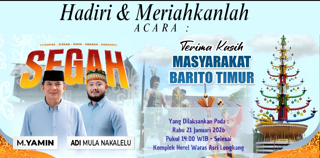 TAMIANG LAYANG — Pasangan Bupati dan Wakil Bupati Barito Timur, M. Yamin dan Adi, menyampaikan ucapan terima kasih kepada masyarakat Kabupaten Barito Timur atas partisipasi dan dukungan dalam proses demokrasi pada tahun 2024 lalu. Ungkapan terima kasih tersebut diwujudkan melalui kegiatan silaturahmi dan berbagi yang digelar pada Kamis (21/1/2026). Ketua Panitia pelaksana, Hengky A. Garu, menjelaskan kegiatan ini merupakan bentuk apresiasi kepada masyarakat yang telah berperan aktif menyukseskan pesta demokrasi, sekaligus memperkuat ikatan kebersamaan antara pemimpin daerah dan warga.“Acara ini kami laksanakan sebagai wujud ucapan terima kasih kepada seluruh masyarakat Kabupaten Barito Timur yang telah berpartisipasi dalam kegiatan demokrasi tahun 2024,” ujar Hengky.Kegiatan tersebut berlangsung di kediaman Ketua Panitia Hengky A. Garu, mulai pukul 14.00 WIB, dan dihadiri oleh berbagai unsur masyarakat.Hengky menjelaskan, kegiatan ucapan terima kasih ini sempat mengalami penundaan. Semula, acara direncanakan digelar sesaat setelah pasangan Yamin–Adi dilantik. Namun, padatnya agenda pemerintahan membuat pelaksanaannya baru dapat direalisasikan pada pertengahan Januari 2026.“Karena kesibukan setelah pelantikan, acara ini sempat tertunda. Dan puji syukur acara ini akan kita laksana pada 21 Januari 2026,” katanya.Melalui kegiatan tersebut, panitia berharap manfaatnya dapat dirasakan langsung oleh masyarakat, sekaligus menjadi penguat dukungan terhadap kepemimpinan Yamin–Adi dalam memimpin Kabupaten Barito Timur selama lima tahun ke depan.“Kami berharap kebersamaan ini terus terjaga dan masyarakat tetap memberikan dukungan agar pasangan Yamin–Adi dapat menjalankan amanah dengan baik demi kemajuan Barito Timur,” tutup Hengky.(Tim).